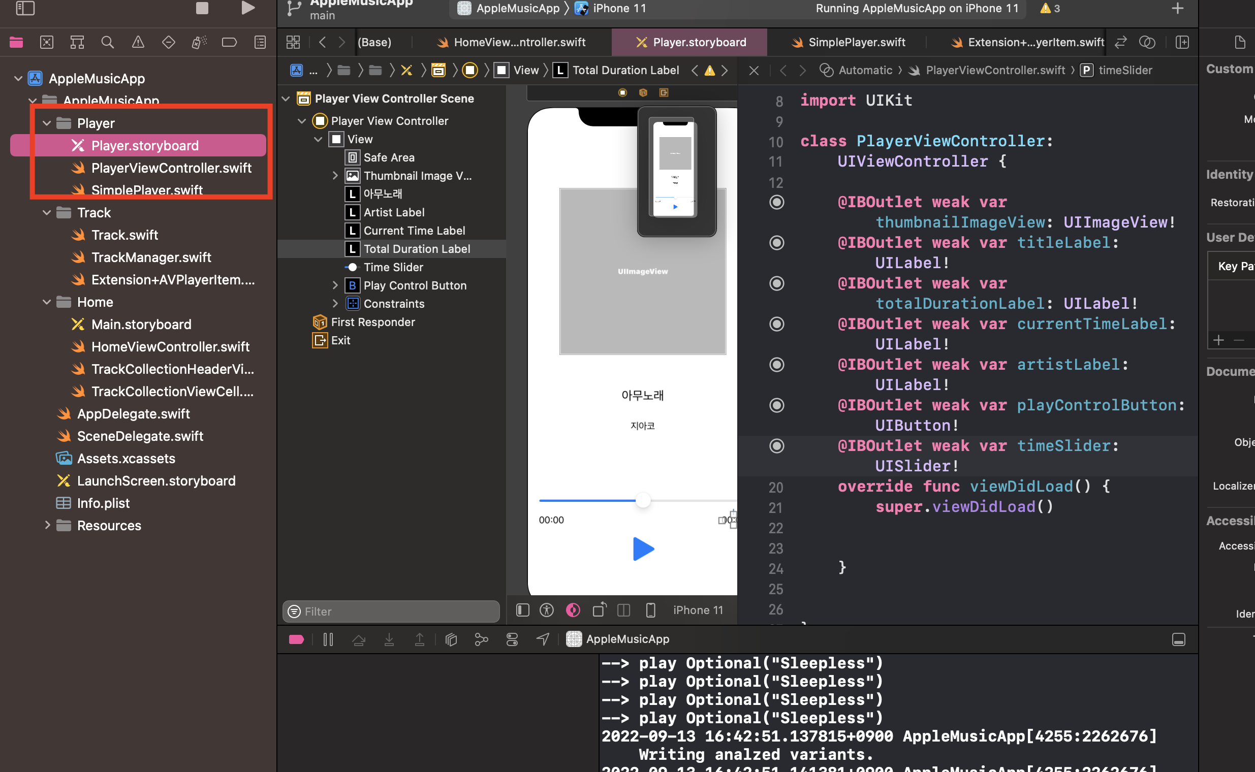 아무튼 Player 화면의 AutoLayout구성과 ViewController 연결은 음.. 많이 한거같으니 넘어가겠다!