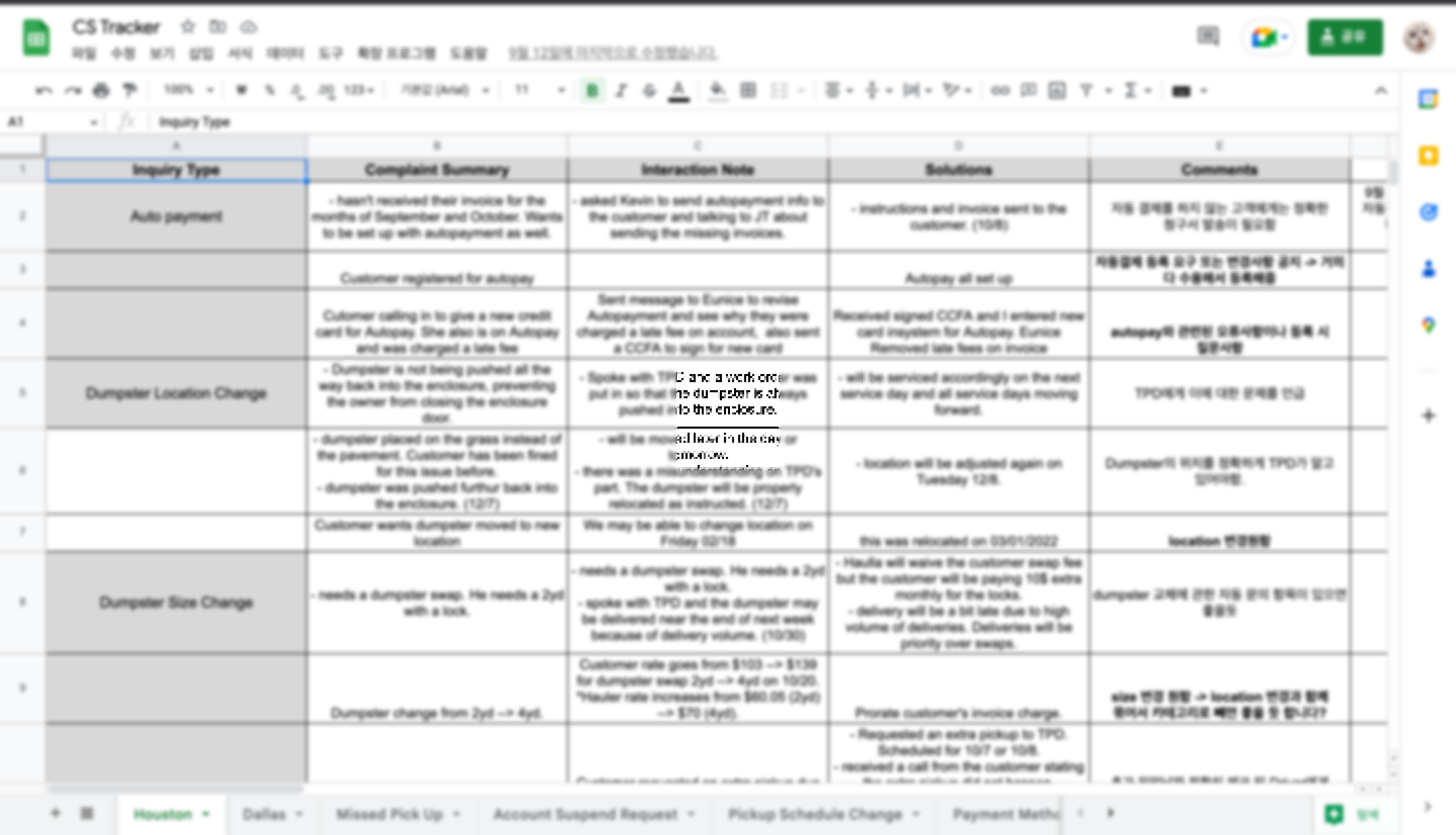가장 고객의 수가 많은 지역인 Houston, Dallas를 중심으로 천여개의 CS 처리 내역을 번역하고 세부 CS 항목 기준에 따라 분류하였다.