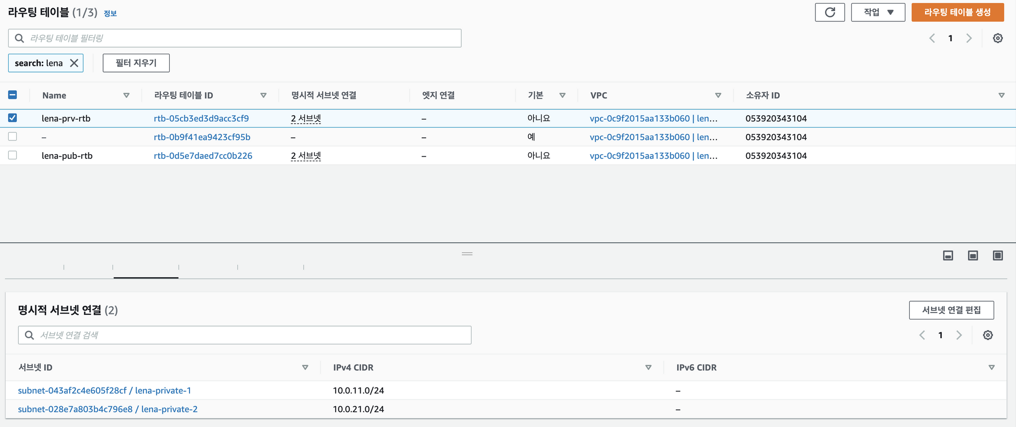pub, prv 라우팅테이블에 해당하는 서브넷 연결