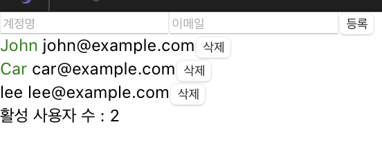 countActiveUsers๋ผ๋ ํจ์๋ฅผ ๋ง๋ค๊ณ active๊ฐ์ด true์ธ ์ฌ์ฉ์์ ์๋ฅผ ์ธ์ด์ ํ๋ฉด์ ๋ ๋๋ง ํด๋ณด์!