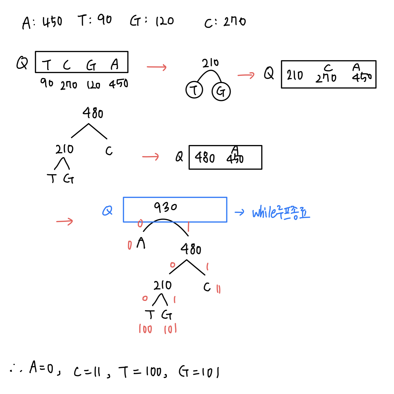 - ํ ๋น๋ ์ฝ๋๋ค์ ๋ณด๋ฉด, ๊ฐ์ฅ ๋น๋์๊ฐ ๋์ 'A'๊ฐ ๊ฐ์ฅ ์งง์ ์ฝ๋๋ฅผ ๊ฐ์ง๊ณ , ๋ฐ๋ผ์ ๋ฃจํธ์ ์์์ด ๋์ด ์๊ณ , ๋น๋์๊ฐ ๋ฎ์ ๋ฌธ์๋ ๋ฃจํธ์์ ๋ฉ๋ฆฌ ๋จ์ด์ง๊ฒ๋์ด ๊ธด ์ฝ๋๋ฅผ ๊ฐ์ง๋ค.