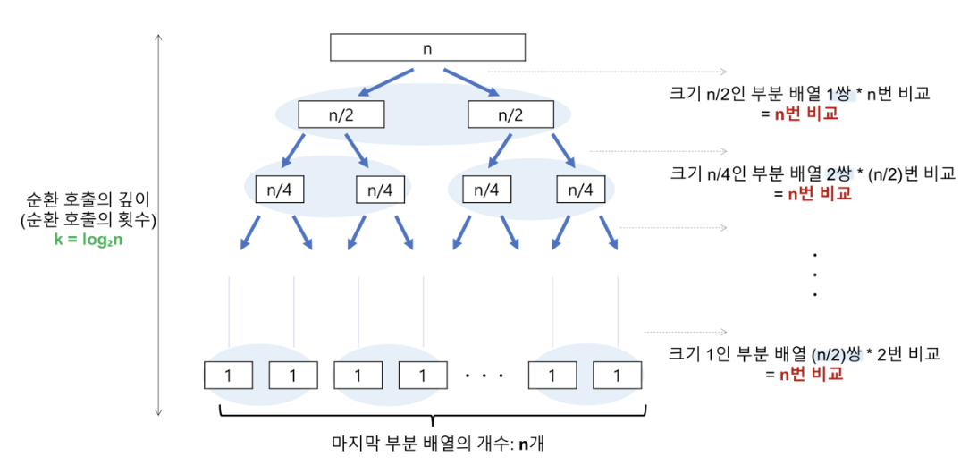 - ๋น๊ตํ์ = ์ํ ํธ์ถ์ ๊น์ด * ๊ฐ ์ํ ํธ์ถ ๋จ๊ณ์ ๋น๊ต ์ฐ์ฐ = nlogโn