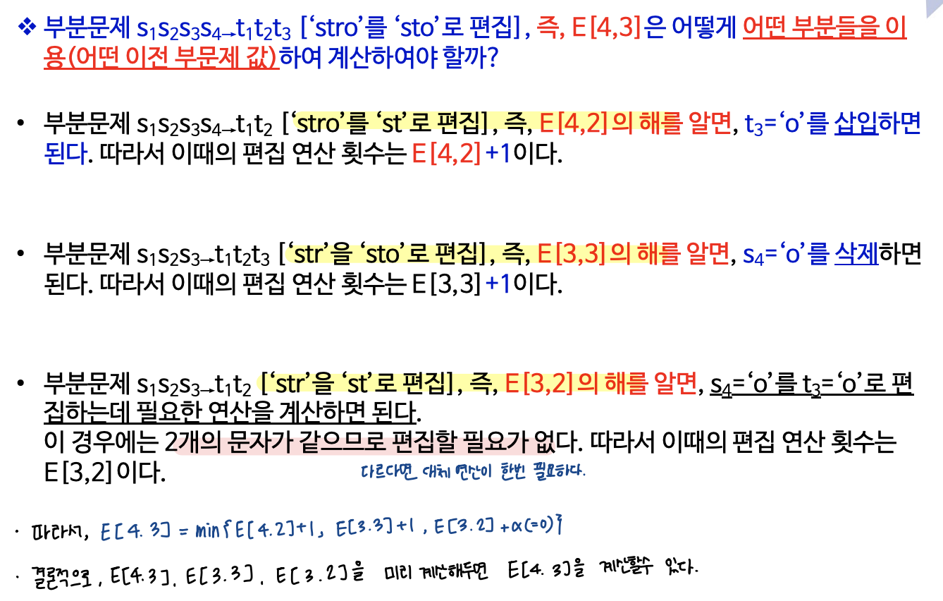 - 만약 접두부에 대한 편집거리를 알고있다면 (최적성의 원리 만족), 각 스트링의 나머지 부분에 대해서 편집거리를 찾음으로써 주어진 입력에 대한 편집거리를 구할 수 있다.
