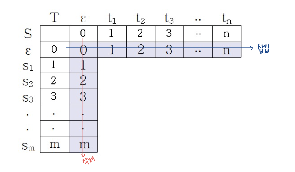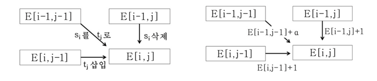 - E[i,j] : S의 접두부의 i개의 문자를 T의 접두부 j개의 문자로 변환시키는데 필요한 최소 편집 연산 횟수, 즉 편집 거리이다.