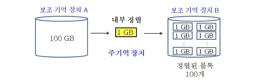 - 즉, 100GB의 데이터를 1GB 만큼씩 주기억 장치로 (100번) 읽어 들이고, 퀵 정렬과 같은 내부정렬 알고리즘을 통해 정렬한 후, 다른 보조 기억 장치에 저장한다.
