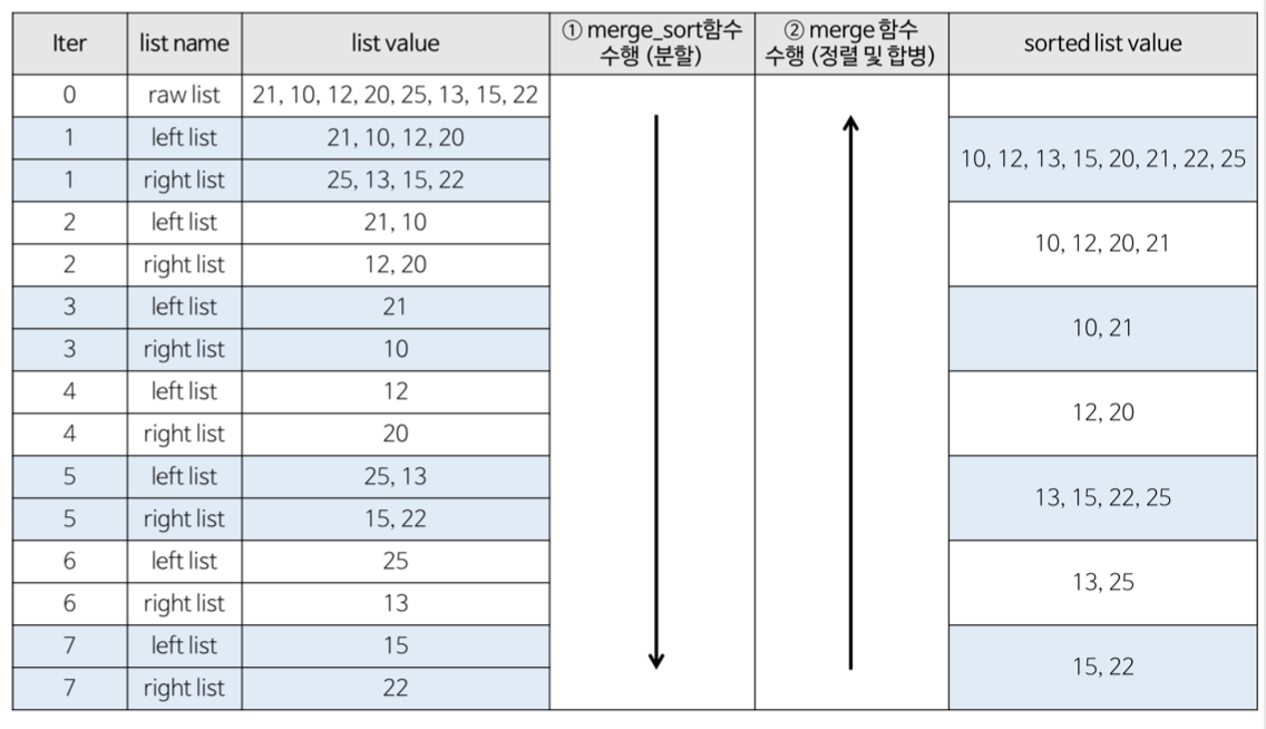 - ํ๋์ ๋ฆฌ์คํธ๋ฅผ ๋๊ฐ์ ๊ท ๋ฑํ ํฌ๊ธฐ๋ก ๋ถํ ํ๊ณ ๋ถํ ๋ ๋ถ๋ถ ๋ฆฌ์คํธ๋ฅผ ์ ๋ ฌํ ๋ค์, ๋๊ฐ์ ์ ๋ ฌ ๋ฆฌ์คํธ๋ฅผ ํฉํ์ฌ ์ ์ฒด๊ฐ ์ ๋ ฌ๋ ๋ฆฌ์คํธ๊ฐ ๋๊ฒ ํ๋ ๋ฐฉ๋ฒ