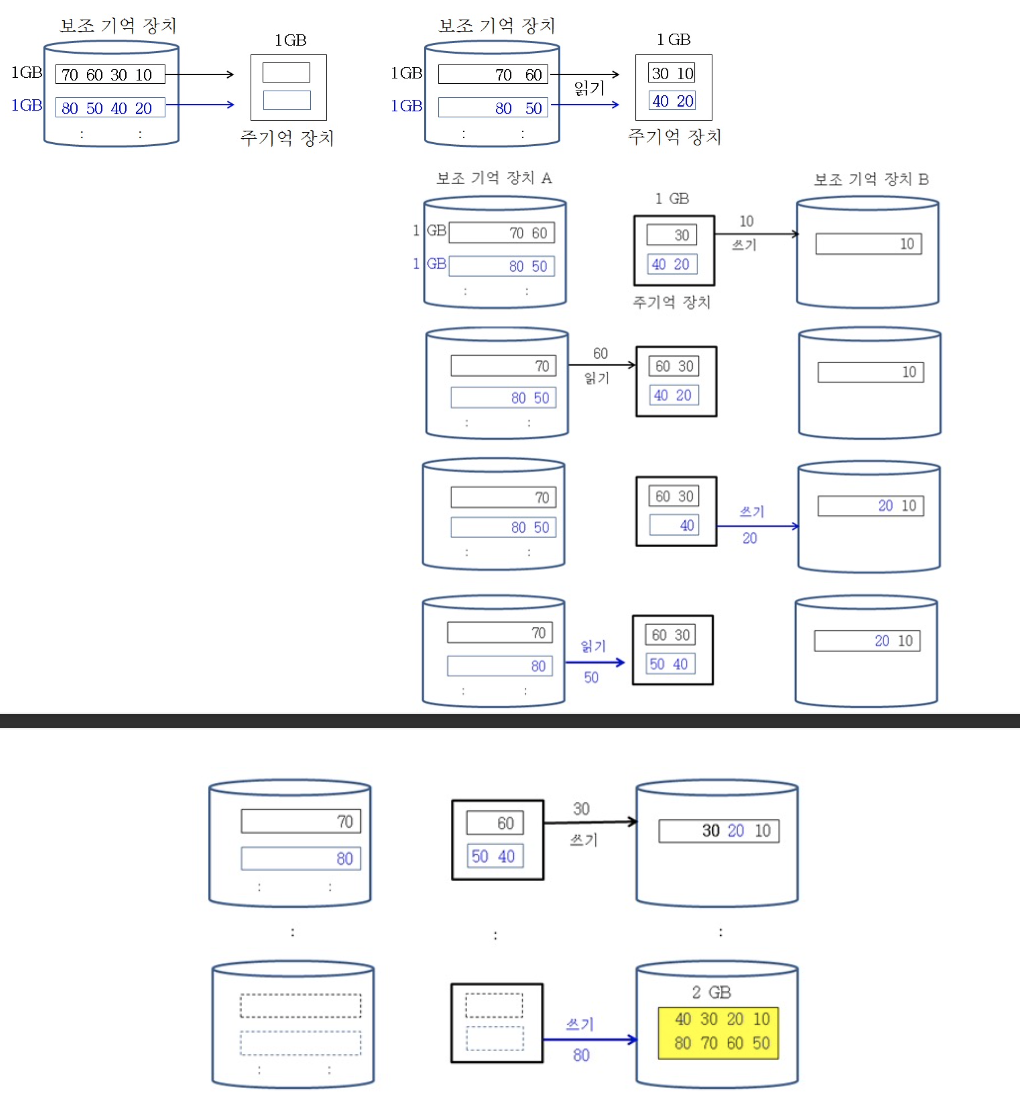 이전에 버블, 선택, 삽입, 합병 등 여러 정렬알고리즘에 대해서 많은 게시글을 올렸었다. 정렬알고리즘의 종류로는 내부정렬, 외부정렬이 있다. 내부정렬 입력의 크기가 주기억 장치의 공간보다 크지 않는 경우에 수행되는 정렬이다. 버블, 선택, 삽입, 합병, 쉘, 힙, 합병, 퀵정렬 등 외부정렬 입력의 크기가 주기억 장치 공간보다 큰 경우, 보조기억 장치에 데이터를 저장하여 정렬을 하고자 하는 경우에 사용된다. 보조 기억 장치에 있는 입력을 여러 번에 나누어 주기억 장치에 읽어들인 후, 정렬하여 보조 기억 장치에 다시 저장하는 과정을 반복한다. 예를 들면, 주기억 장치의 용량이 1GB이고, 입력 크기가 100GB라면, 어떤 내부 정렬 알고리즘으로도 직접 정렬할 수 없어서 외부 정렬알고리즘을 사용해야한다. 1️..