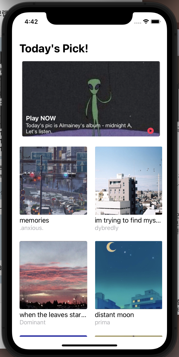 이전 포스팅 - AppleMusicApp(1) : 뷰 구성 - AppleMusicApp(2) : Track 모델 (데이터 구조) - AppleMusicApp(3) : UiCollectionViewCell 업데이트 - AppleMusicApp(4) : HeaderView (CollectionReusableView) - AppleMusicApp(5) : Player 화면 + 싱글톤 - AppleMusicApp(6) : 뷰사이 데이터 이동 - AppleMusicApp(7) : Music Slider 기능 자세한 코드는 여기로! https://github.com/yexjin/iOS_Study/tree/main/AppleMusicApp GitHub - yexjin/iOS_Study: iOS 토이프로젝트 모음집📱 ..