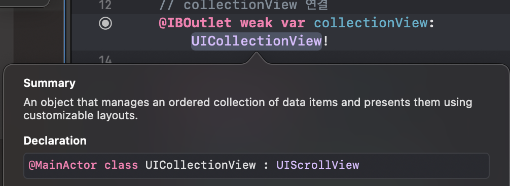 🌱 UICollectionViewDelegate - 사용자와 CollectionView의 아이템 사이의 상호작용을 관리해주기 위한 객체들에 의해 채택된 방식 - 이 프로토콜의 메소드들은 모두 Optional! 이 프로토콜을 통해 CollectionView의 Cell 클릭시 일어날 이벤트를 설정할 수 있다. 실습 해볼 내용 - HomeViewController의 CollectionViewCell 클릭 시, PlayerViewController를 가져와서 HomeView 에서 PlayerView로 전환시켜보겠다 extension HomeViewController: UICollectionViewDelegate { // 클릭했을때 어떻게 할까? func collectionView(_ collectionView:..